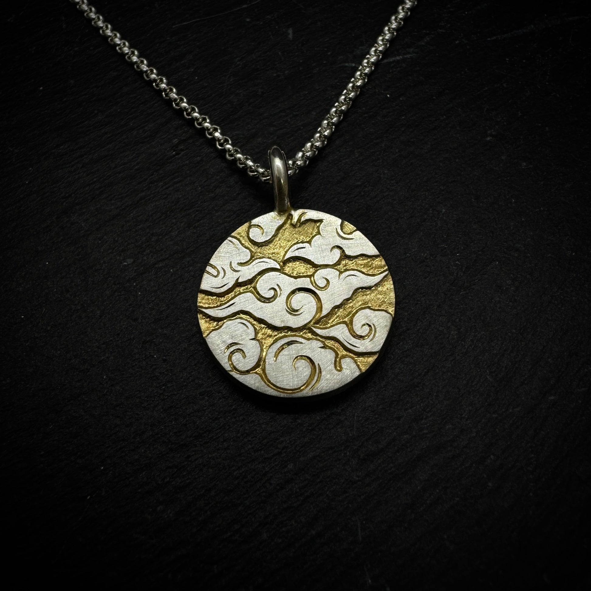 Handcrafted and engraved sterling silver pendant, clouds, with gold-plated background.